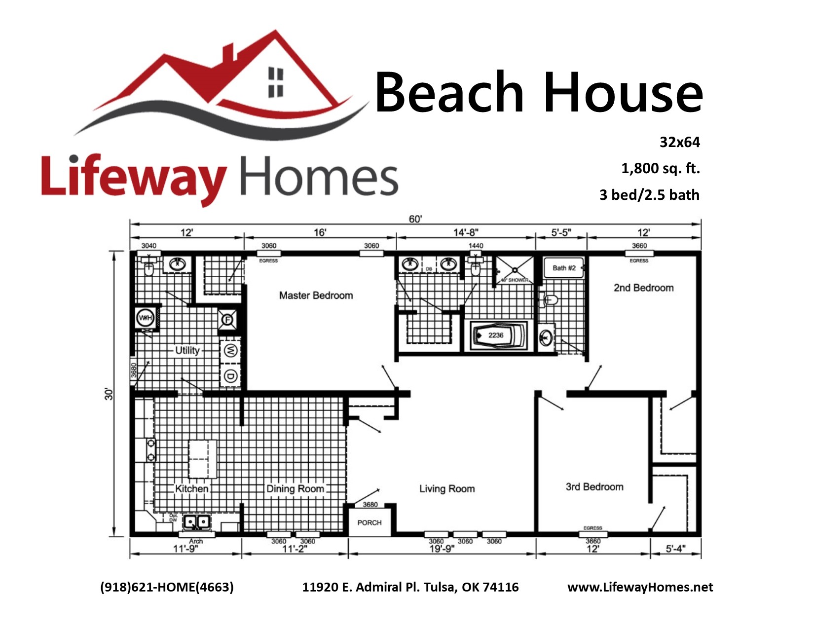 The Beach House is 32 feet wide by 64 feet long with 1800 Square Feet of space. The house is a closed off floor plan yet, it seems like an open one with the space. You can add up to 20 feet more in length which is 600 Square Feet more. The light colors, white all wood cabinets, and reverse wainscot give it a beach house feel. This home has 2 master closets. The tiled shower and large tub look great. A pot-filler on the wall by the stove make it an ease to fill your pots and pans. Also, the white wood barn door in front of the wash room slides back and forth with ease. Feel close to those with you cause of the light walls as well as the lay out.